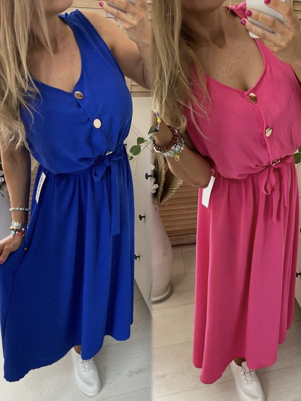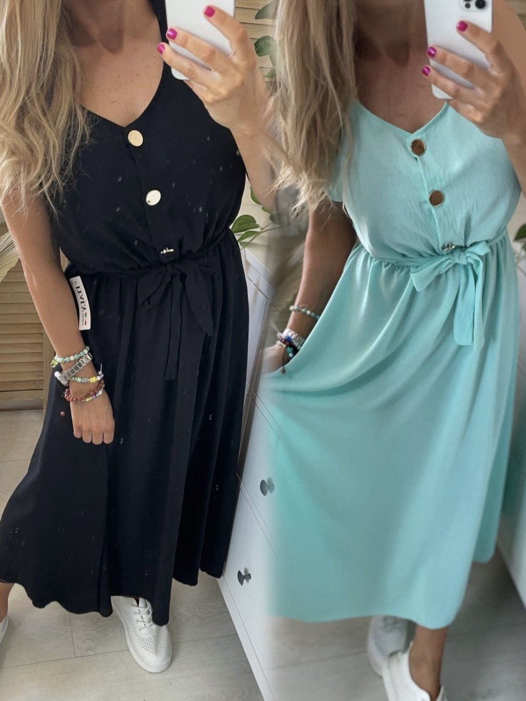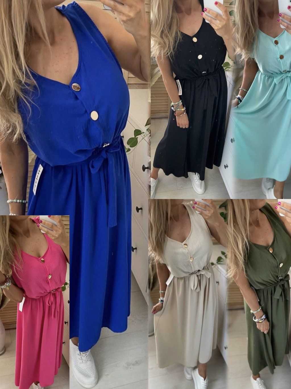 Elegantní dlouhé šaty značky LEONELA z lehkého, splývavého materiálu. Díky zavazování v pase krásně zvýrazní postavu a přizpůsobí se siluetě. Jemné zlaté knoflíčky dodávají šatům ženský detail.