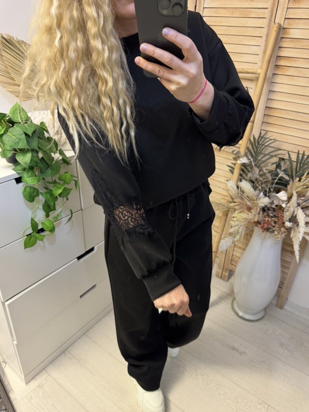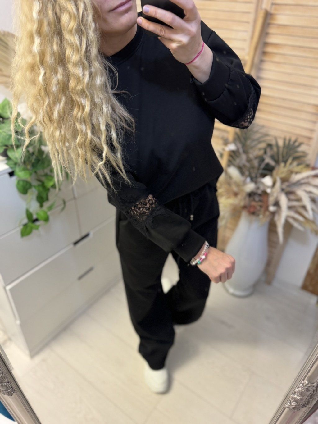 Měkký, příjemný materiál doplněný jemnou krajkou na rukávech dodává celému outfitu elegantní vzhled.