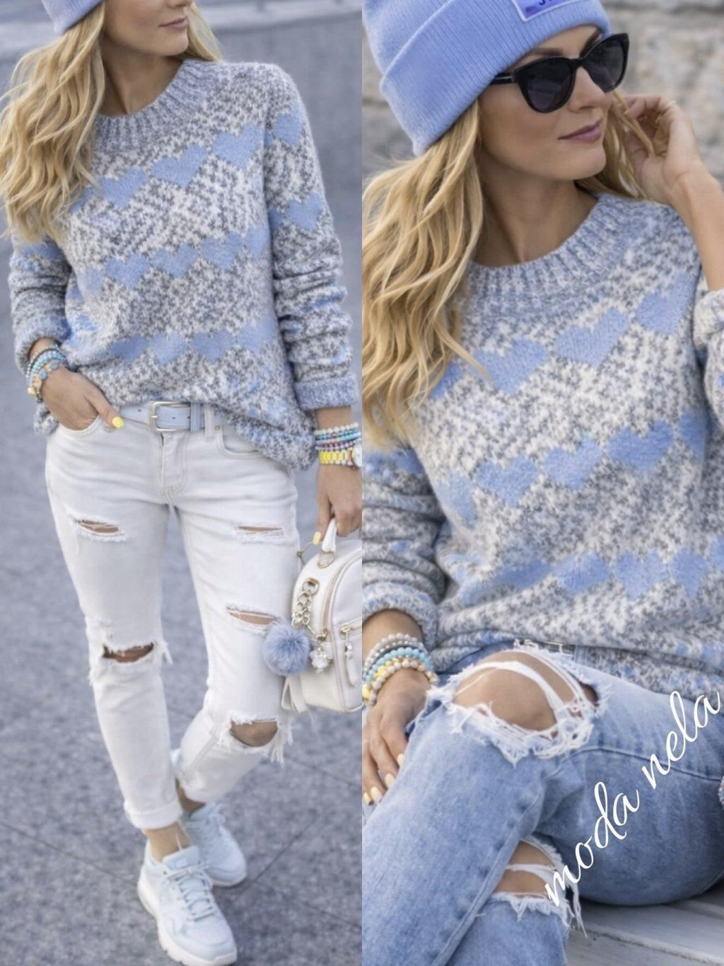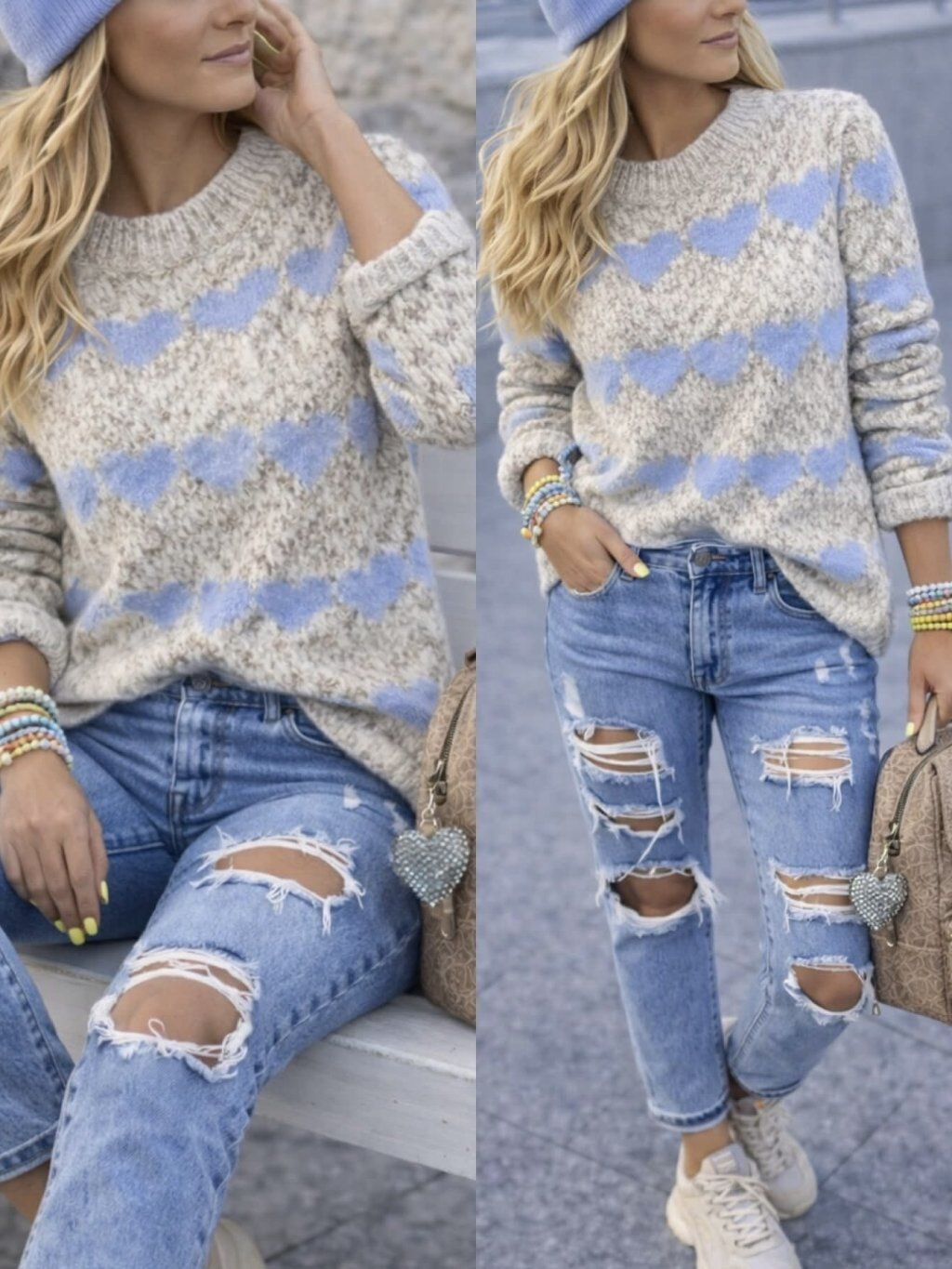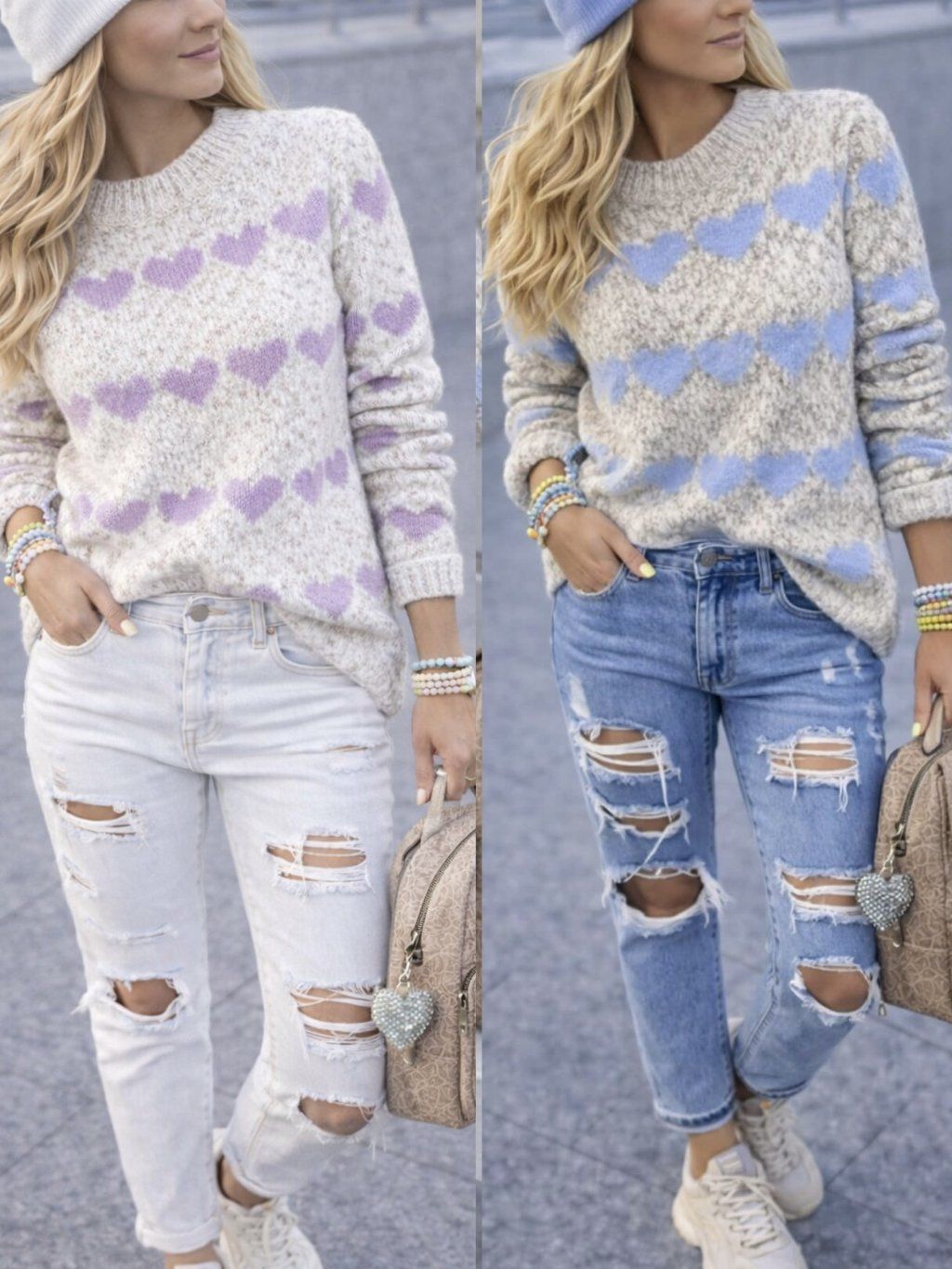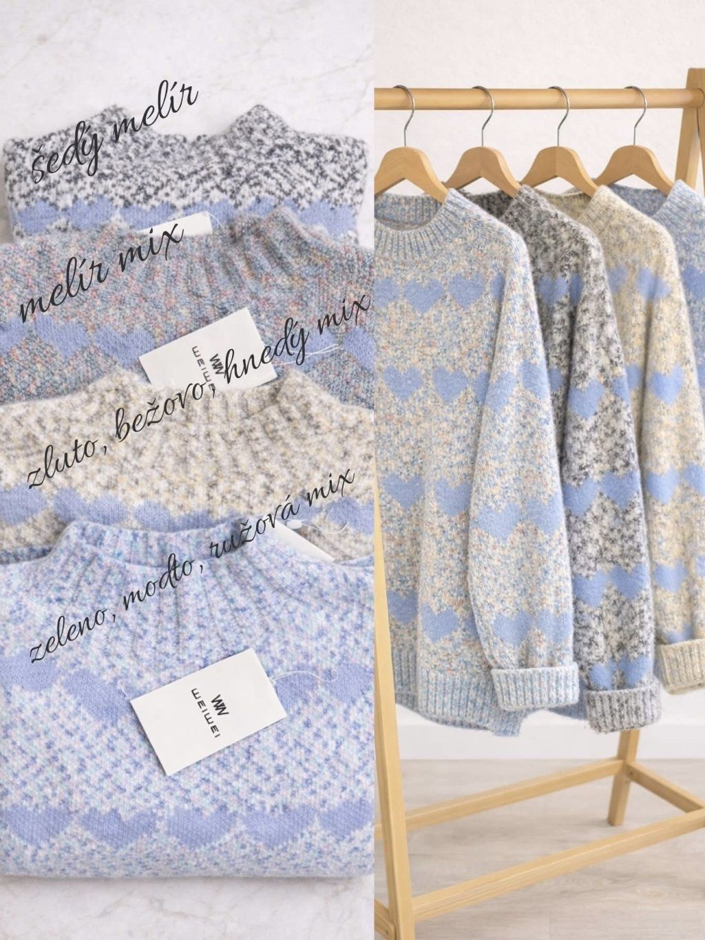 Jemný melírovaný vzor doplněný o srdíčka dodává svetru něžný, ale stylový vzhled. Perfektně se kombinuje s džíny i elegantnějšími kalhotami.
