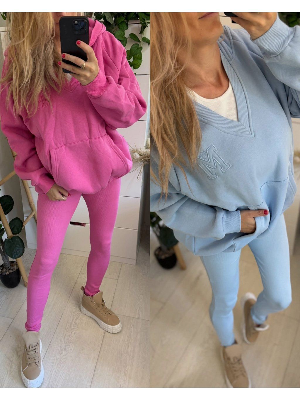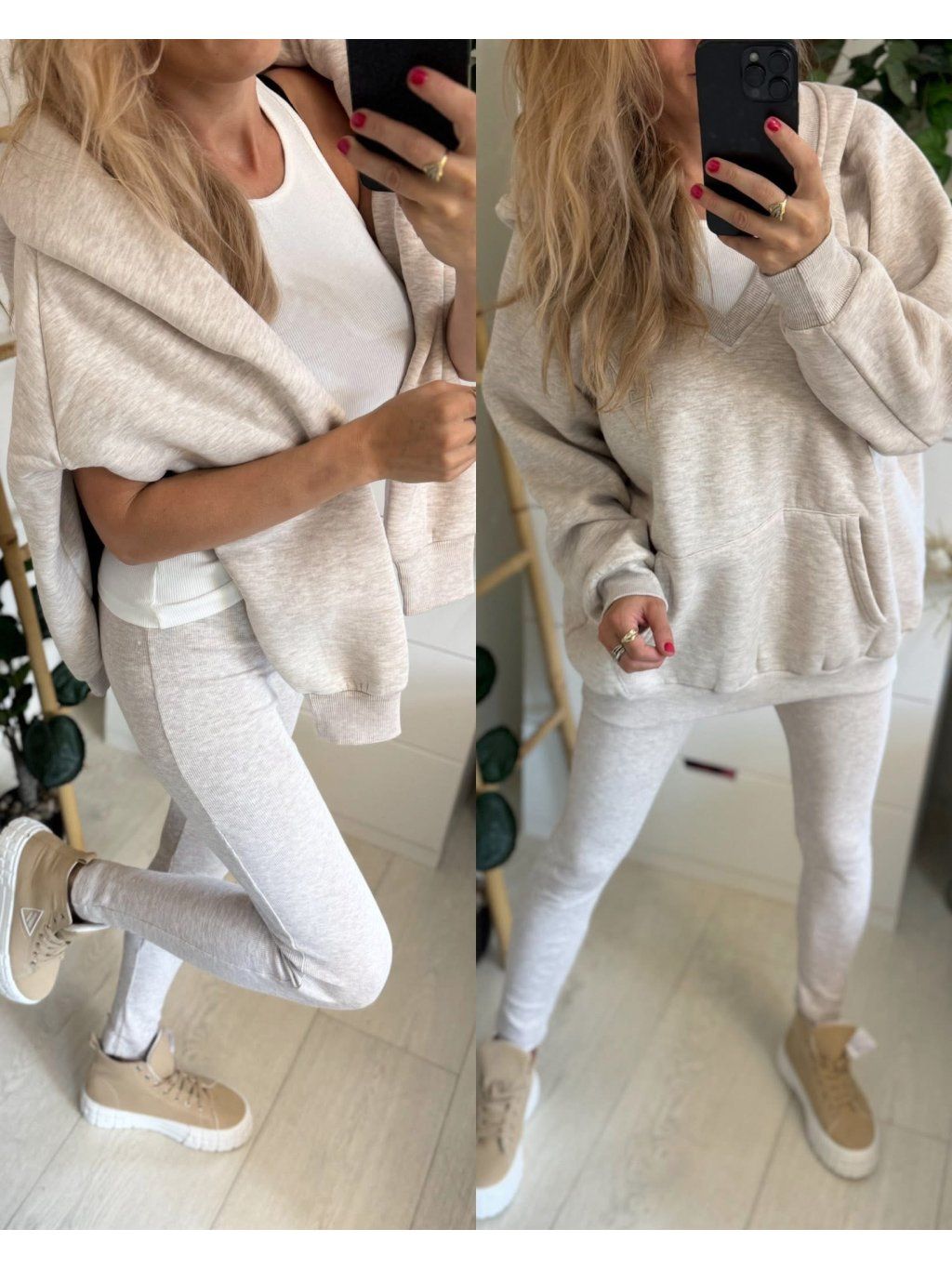 Stylový a maximálně pohodlný komplet, který unosíš každý den. Set obsahuje žebrované legíny, bílé žebrované tílko a vyteplenou mikinu s kapsou. Ideální na volný čas, do města i na cestování.