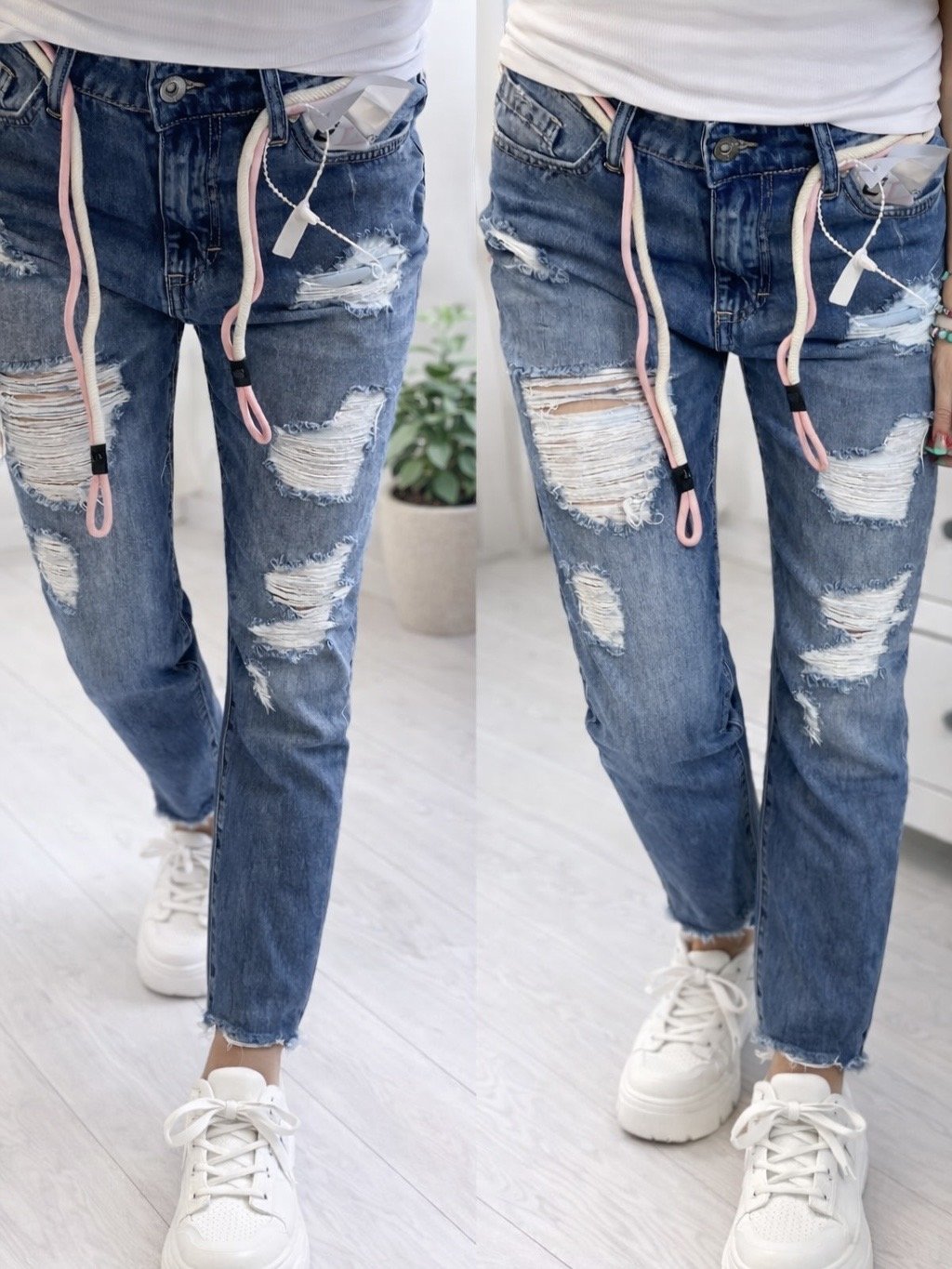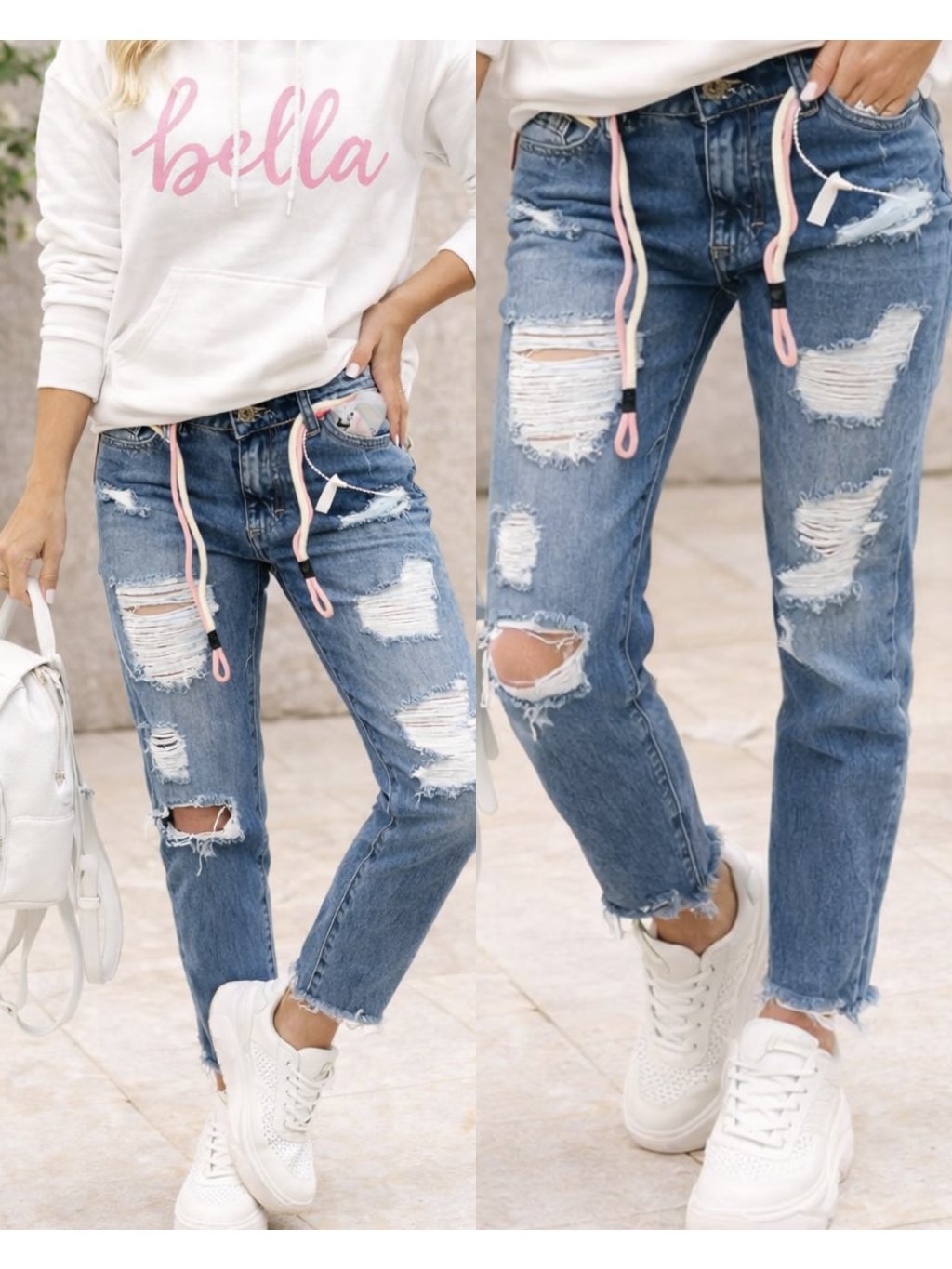 Stylové trhané džíny s barevným tkaničkovým páskem, který je součástí a lze jej vyndat.