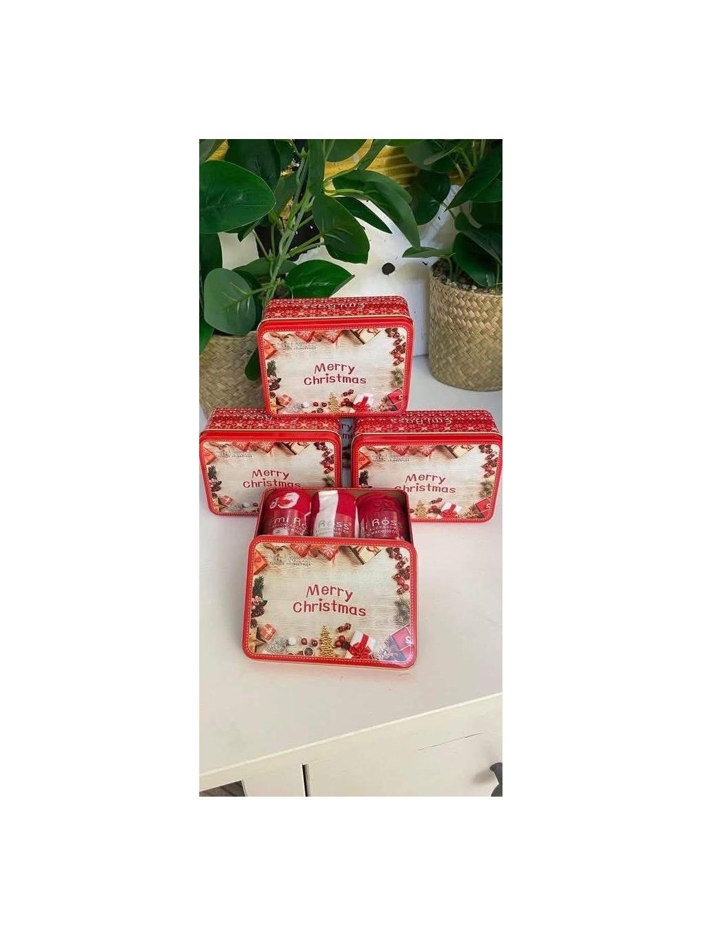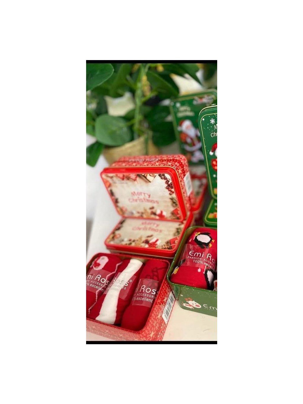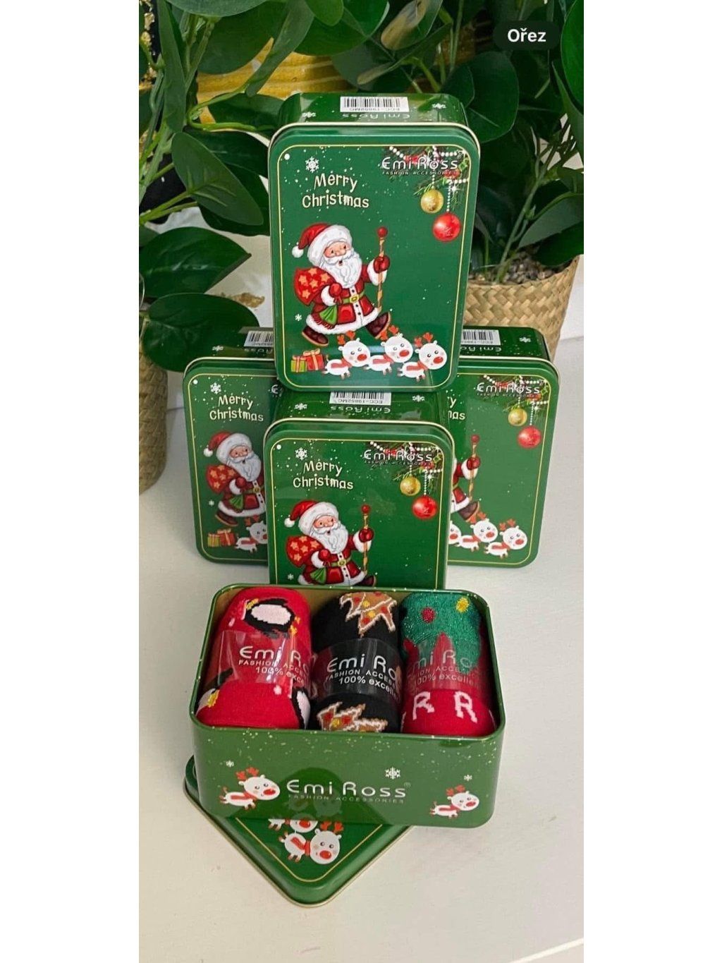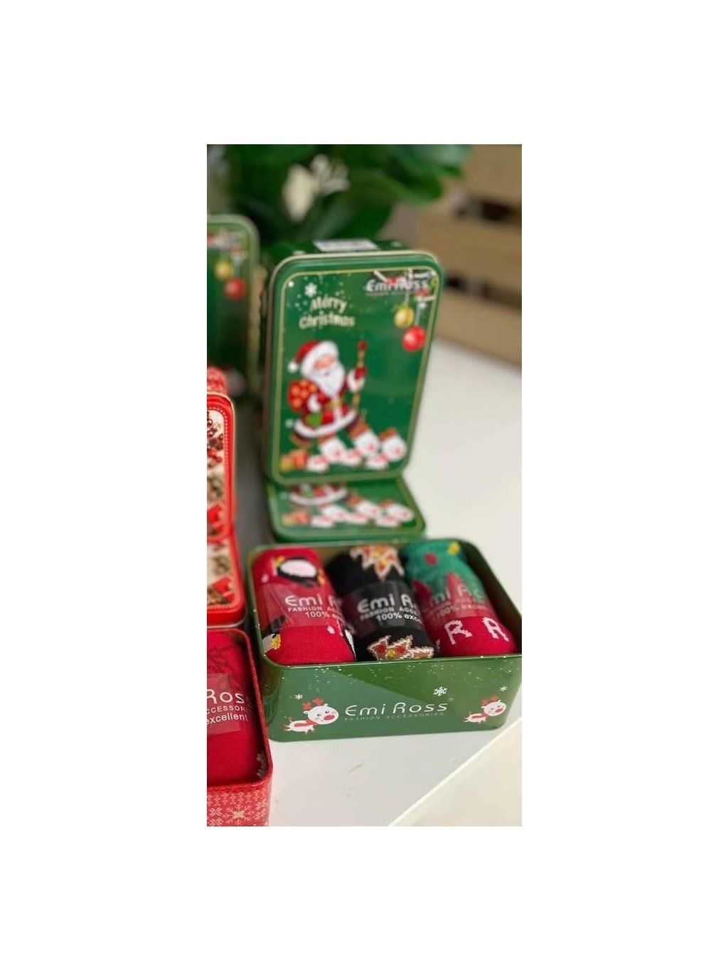 Krásné vánoční ponožky v plechové uzavíratelné krabičce ( 3páry ponožek v baleni)